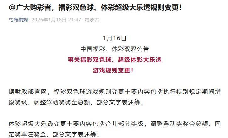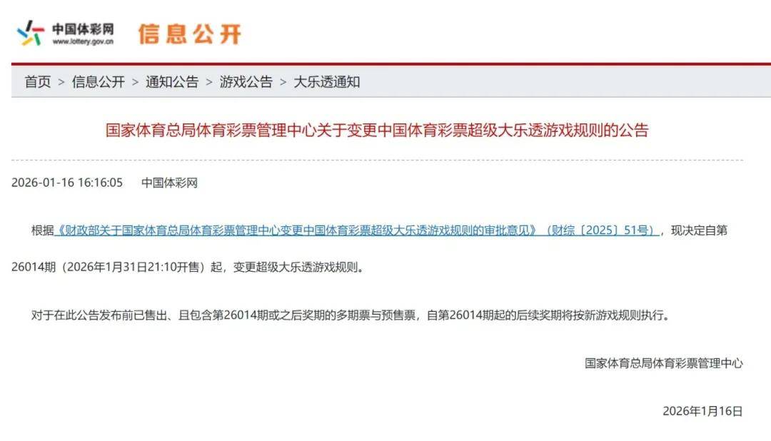 面对彩票销售的断崖式下跌,相关部门终于出手了,2026年1月16日,中国福利彩票发行管理中心、国家体育总局体育彩票管理中心联合发了公告,推出了近30年以来力度最大的彩票新规,从2026年2月开始正式实施。